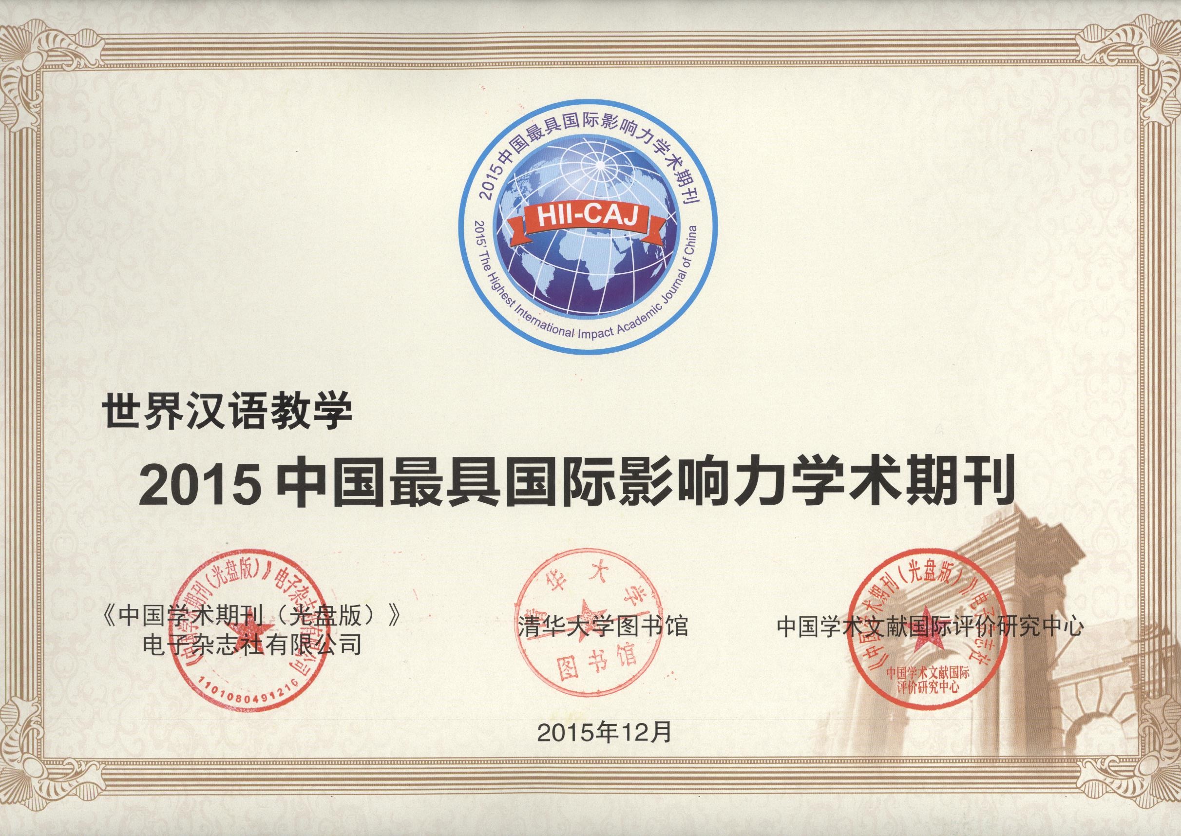 2015年12月18日,由中国期刊协会、中国科学技术期刊编辑学会、中国高校科技期刊研究会、全国高等学校文科学报研究会、中国学术期刊(光盘版)电子杂志社有限责任公司5家单位联合主办、同方知网承办的“中国学术期刊未来论坛”在北京九华山庄隆重举行。中国学术期刊(光盘版)电子杂志社有限责任公司和清华大学图书馆在会上联合发布了《2015中国学术期刊国际引证年报》,《世界汉语教学》再次入选“中国最具国际影响力学术期刊”名单,这是《世界汉语教学》连续三年获此称号。“中国最具国际影响力学术期刊”(人文社会科学)是基于期刊国际影响力指数CL,从全国1220种人文社科期刊中选出的TOP5%期刊,共计入选60种。